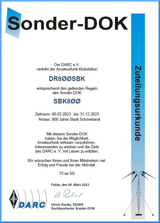 Wir möchten diesen 800. Jahrestag nutzen, um diese Tradition weiterzuführen und unsere Vereinsarbeit in Schönebeck zu präsentieren. Dabei haben wir uns etwas Besonderes ausgedacht: Bis zum Ende des Jahres haben wir ein Sonderrufzeichen beantragt, welches uns die Möglichkeit gibt, unseren Verein und unsere Stadt deutschlandweit zu repräsentieren.