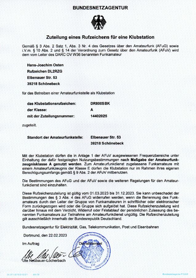 Aber das ist noch nicht alles! Wir haben auch einen Sonder DOK beantragt, den wir für unsere Funkverbindungen verwenden können. Der DOK (Distrikts-Orts-Kenner) ist eine wichtige Kennung innerhalb der Amateurfunk-Community und wird verwendet, um die geografische Zuordnung des Funkverkehrs zu erleichtern. Unser Sonder-DOK lautet SBK800.